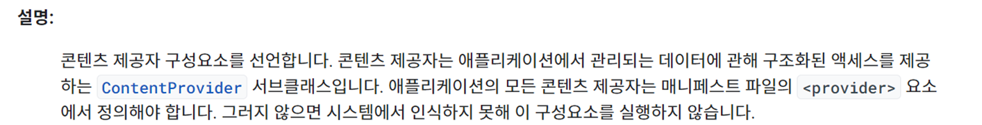 안드로이드의 보안수칙에 따라서 앱 외부의 콘텐츠(주소록, 저장소 등등)에 접근하기 위해서는 무조건 콘텐츠 제공자(Content Provider)를 사용해야합니다. 이중에서도 <provider>는 콘텐츠 제공자의 구성요소를 선언하는 부분으로 Content Provider의 서브클래스 입니다. <application>태그 사이에 작성해주도록 합시다.