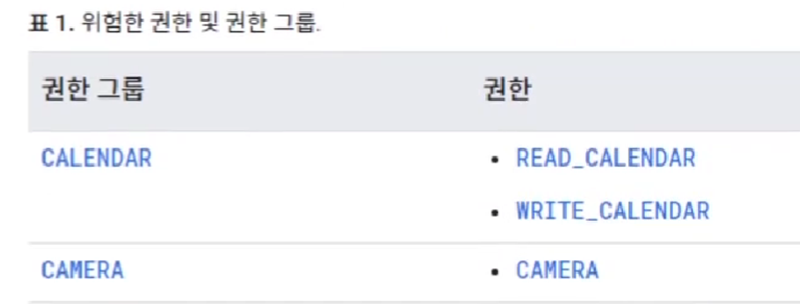 안드로이드 공식문서를 보면 카메라와 캘린더 등의 디바이스의 기능에 접근하는 권한들을 위험한 권한으로 분류해놓은것을 볼 수 있다.